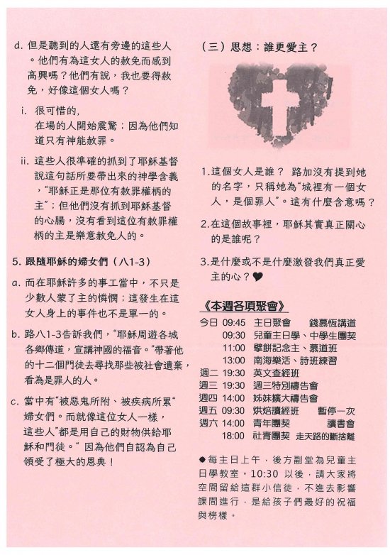 講 員: 錢慕恆 (主題:誰更愛主? 經文:路加福音7:36~8:3)<錄音連結><影音連結>