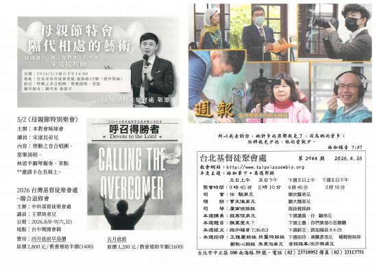 [公告] 2026年4月22日教會禱告信(臺北基督徒聚會處)